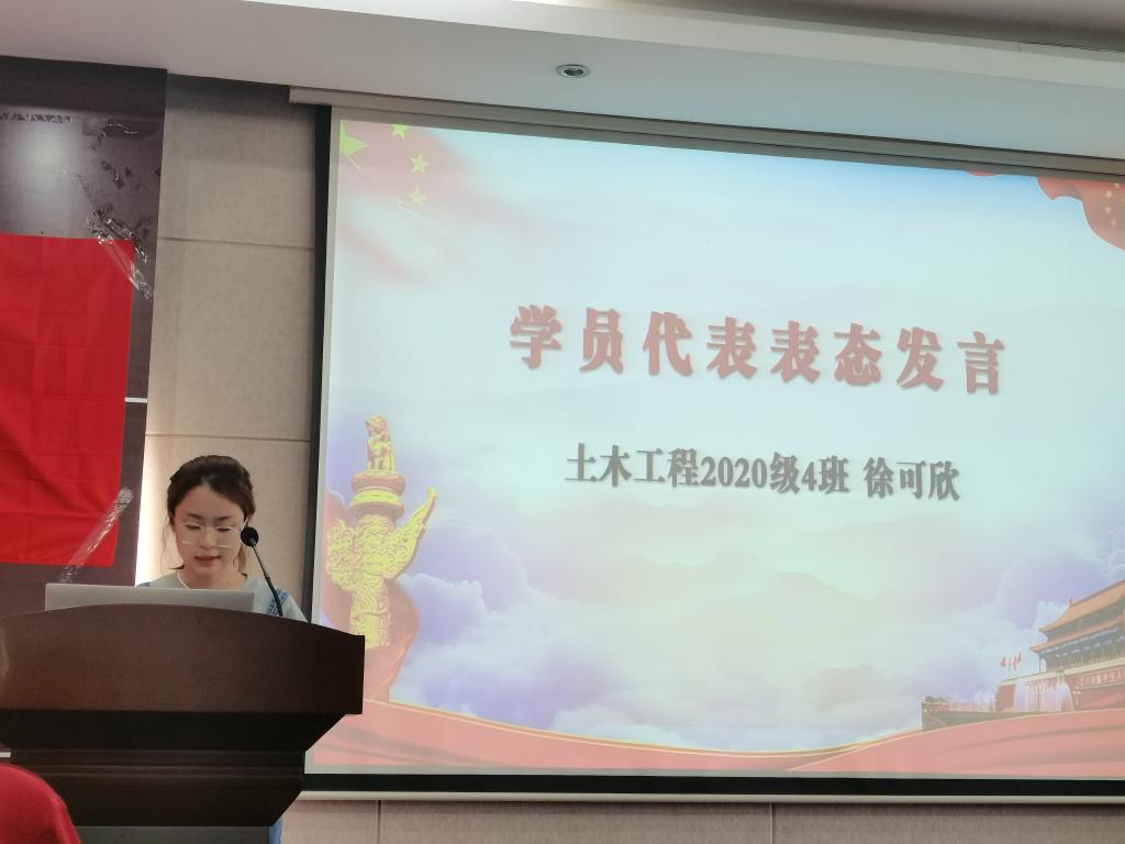 土木2004班徐可欣作为学员代表进行表态发言。她承诺,要以党的信念为思想的明灯,以党的原则为行为准则,努力克服自己的缺点,加强理论学习和专业素养的培养,做新时代,勇担时代使命的新青年。