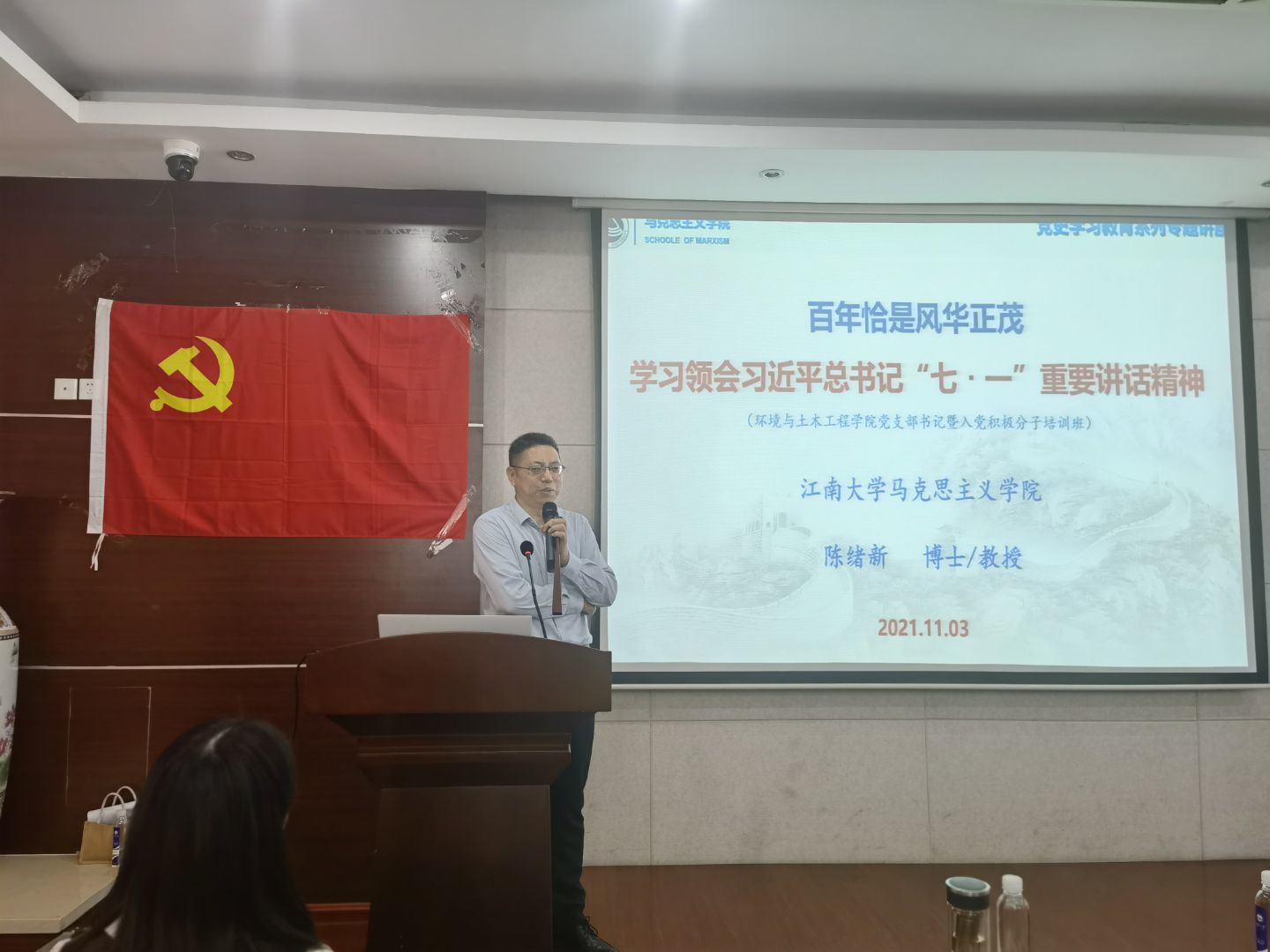 马克思主义学院陈绪新教授以“百年恰是风华正茂——学习领会习近平总书记‘七一’重要讲话精神”为题,开启培训班理论学习第一讲。陈教授从1个主题—实现中华民族的伟大复兴;1个精神—伟大的建党精神;4大成就—百年辉煌的历史进程与伟大成就;9大经验—以史为鉴、开创未来,四个角度,讲解了习近平总书记在两个一百年交汇点的重要讲话。
