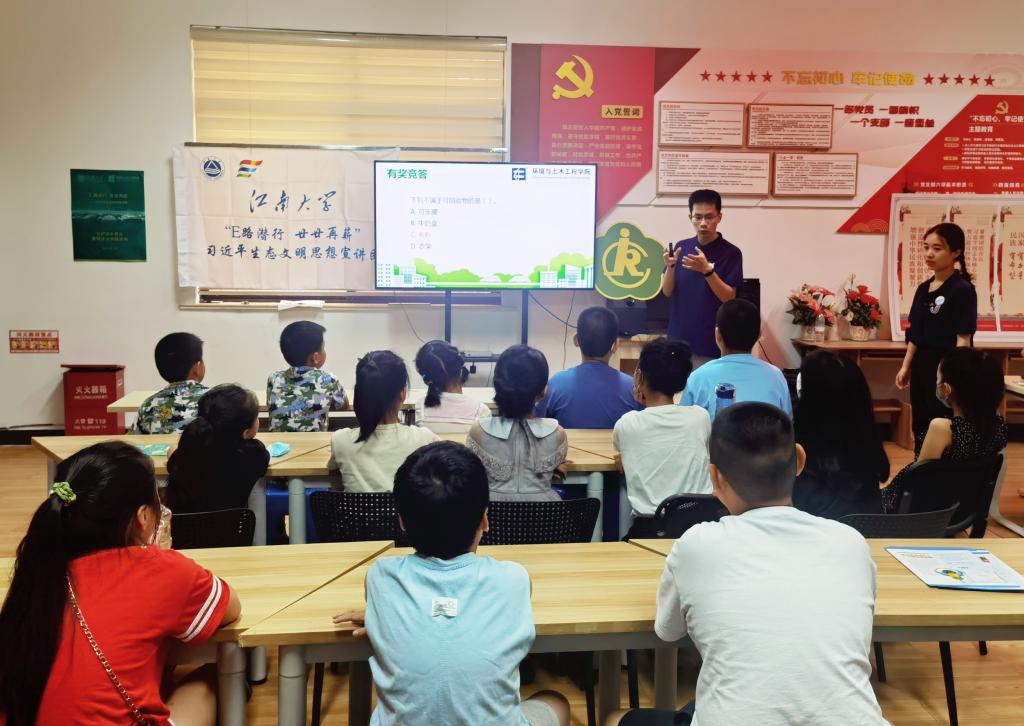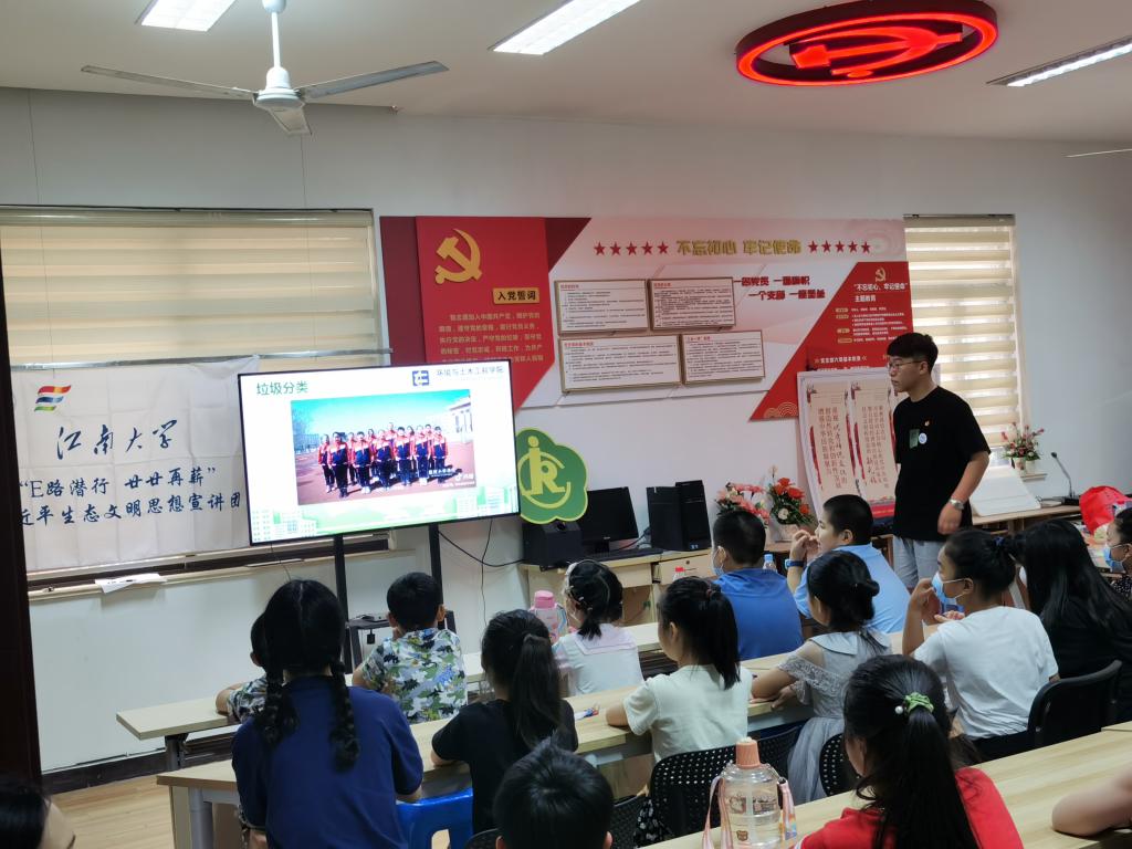 环境与土木工程学院辅导员周期老师带领“E路潜行,廿廿再薪”习近平生态文明思想宣讲团一行12人,到无锡市崇安寺街道东河花园社区开展环保主题宣讲,在宣讲会上与社区内的小学生们进行互动和交流。东河花园社区负责人陈怡西参与了会议。