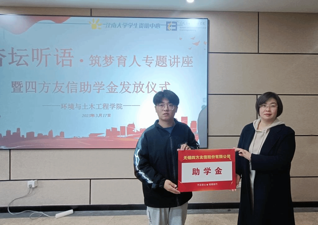 2023年3月17日下午,环境与土木工程学院在D305举行四方友信助学金发放仪式暨杏坛听语·筑梦育人专题讲座,环境与土木工程学院党委副书记、副院长胡娟,环境与土木工程学院分团委书记、学工办主任周佳赟,辅导员何涛、李东辉出席,部分四方友信助学金受助学生现场参会,会议由薛羚伟主持。