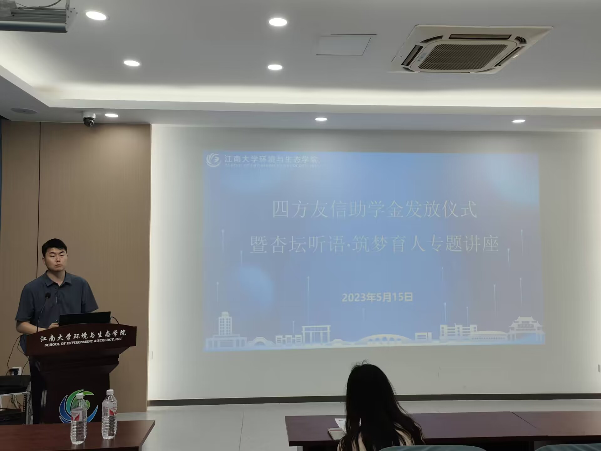 在D303举行四方友信助学金发放仪式暨杏坛听雨·筑梦育人专题讲座,会议由辅导员李东辉主持,四方友信助学金受助学生到现场参会。