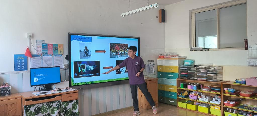 在李沧区夏庄路幼儿园,实践团成员开展奥运知识科普,穆英杰以“最孤单的奥运冠军”王丽萍在2000年悉尼奥运会为我国田径夺得首金却寻遍全场没有一面国旗,到今年樊振东拿下乒乓球男单冠军时全场合唱国歌的今昔对比为切入点,向幼儿园小朋友们讲述了中国在奥林匹克舞台上从无到有、从弱到强的故事,通过国乒混双金牌上跨越国界的合照,体现出了新时代中国运动员的自信和大国担当。