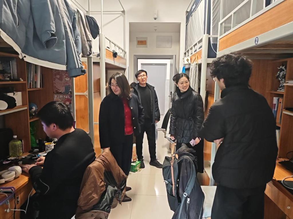 走访期间,学院老师与同学们亲切交谈,细致询问假期生活、返校适应情况及新学期学业规划。胡娟在走访中特别关注宿舍安全情况,她叮嘱学生们在日常生活中如遇到安全问题要及时向保卫处和辅导员反映,每进入一间宿舍,都强调要定期打扫宿舍卫生、注意用水用电规范、严禁使用违章电器。辅导员重点关注学生们的课程安排和学习计划,鼓励大家合理安排时间,积极参与实习实践、科研竞赛和学院文体活动。