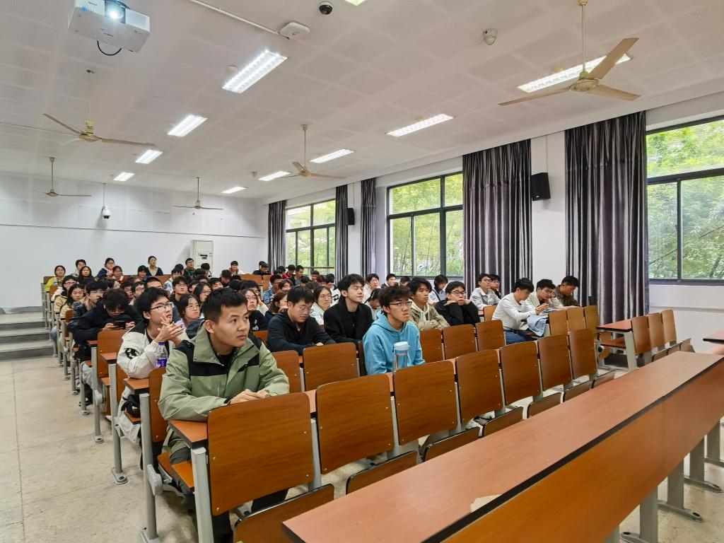 于近日在一教C101举行新生转型教育系列讲座暨年级大会。学院教务老师王硕,本科辅导员李猛、万骋宇,全体2025级本科新生参加活动。