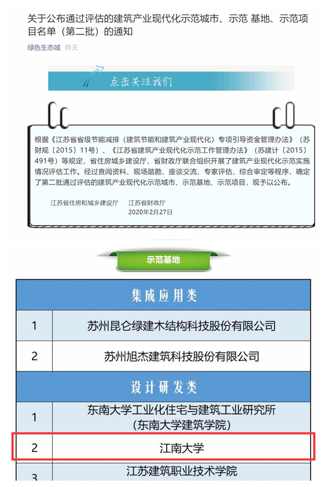 2月27日,江苏省住房和城乡建设厅、江苏省财政厅公布的通过评估的建筑产业现代化示范城市、示范基地、示范项目名单(第二批),经过2016—2019年四年的建设,av片 获批江苏省装配式建筑设计研发类示范基地,该项目由环境与土木工程学院邹昀教授主持。