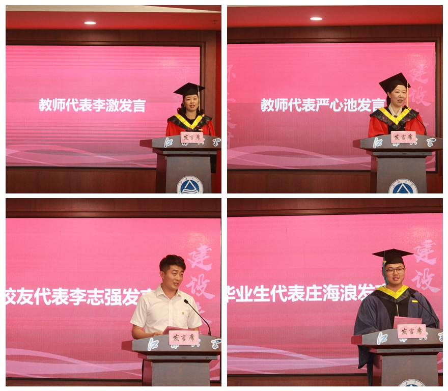 无锡市五一巾帼标兵获得者、环境工程专业李激教授,至善教学奖获得者、土木工程专业严心池副教授作为教师代表发言。她们肯定了各位完成学业、顺利毕业的同学们在学校中的努力,同时也向同学们表达了热烈的祝贺和美好的祝愿,勉励同学们在今后的生活中勇敢面对和承担自己的责任。