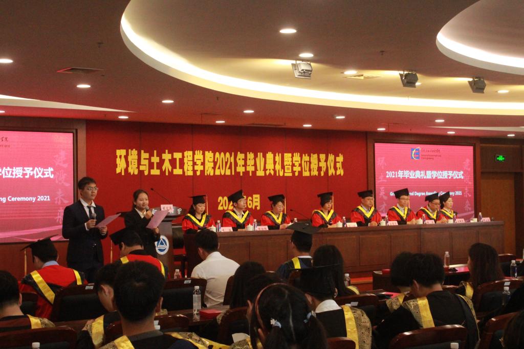 又是一年毕业季,依然十里栀花香。6月19日下午,环境与土木工程学院2021年毕业典礼暨学位授予仪式在图书馆510报告厅举行。院党委书记李艳,院长王震宇,副院长邹华、缪恒锋、王新华,环境工程专业李激教授,环境工程系副主任张衍,土木工程系主任刘文化,工程管理系主任沈洪明,毕业班班主任薛羚伟、严心池、付小英、张清峰、李祎飞出席典礼。环境与土木工程学院2021届全体毕业生参加了本次典礼。典礼由院党委副书记胡娟主持。