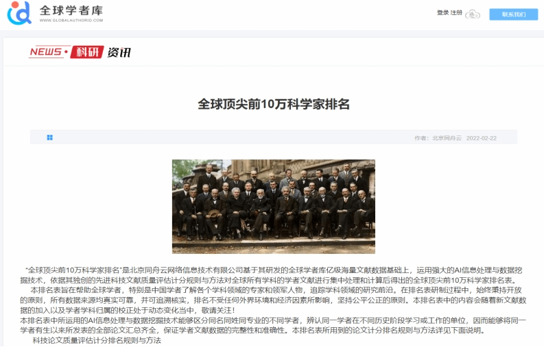 此次“全球顶尖前10万科学家”是根据学者发表的学术论文及其深度分析结果作为核心评分依据。在论文评估计分过程中,将Metrics 期刊评分、论文被引频次、论文类型、作者署名排位(论文贡献度)、作者H指数等多种反映论文-作者学术影响力的潜在重要因素综合考虑,设置权重,力求透过论文的诸多核心因素精确评价学者的学术影响力。全球学者库的算法能够覆盖全球所有领域的学者,能够区分同名同姓的不同学者(甚至同机构同院系的同名学者)、并能把同一学者的佚名及学术迁徙进行合并,是读者了解领域专家、追踪研究前沿、人才价值评价的重要参考依据。