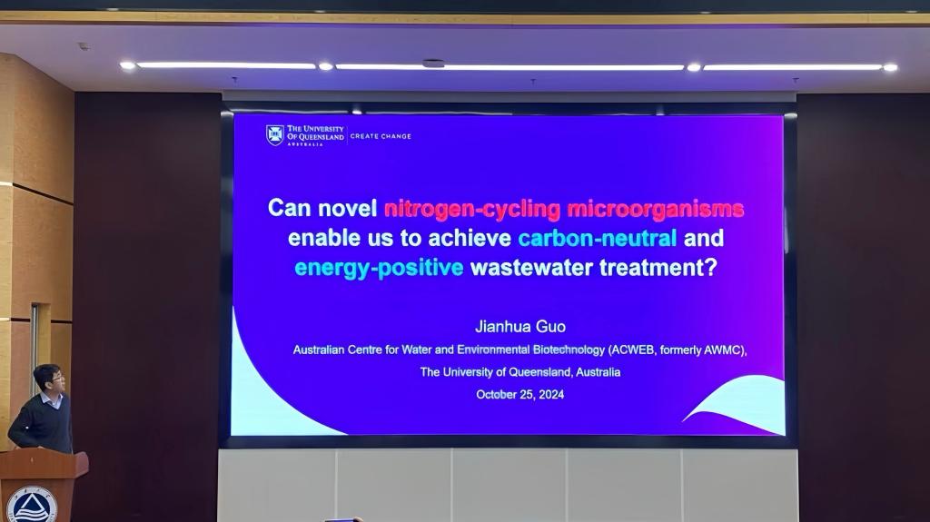 东氿校区清源楼A101举办了2025年第一场“金山·环境大讲堂”讲座。本次讲座邀请了澳大利亚昆士兰大学水中心副主任郭建华教授作为主讲嘉宾,学院教师、研究生等50余人参加了此次讲座活动。讲座由学院陈思思副研究员主持。