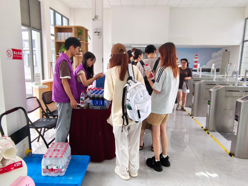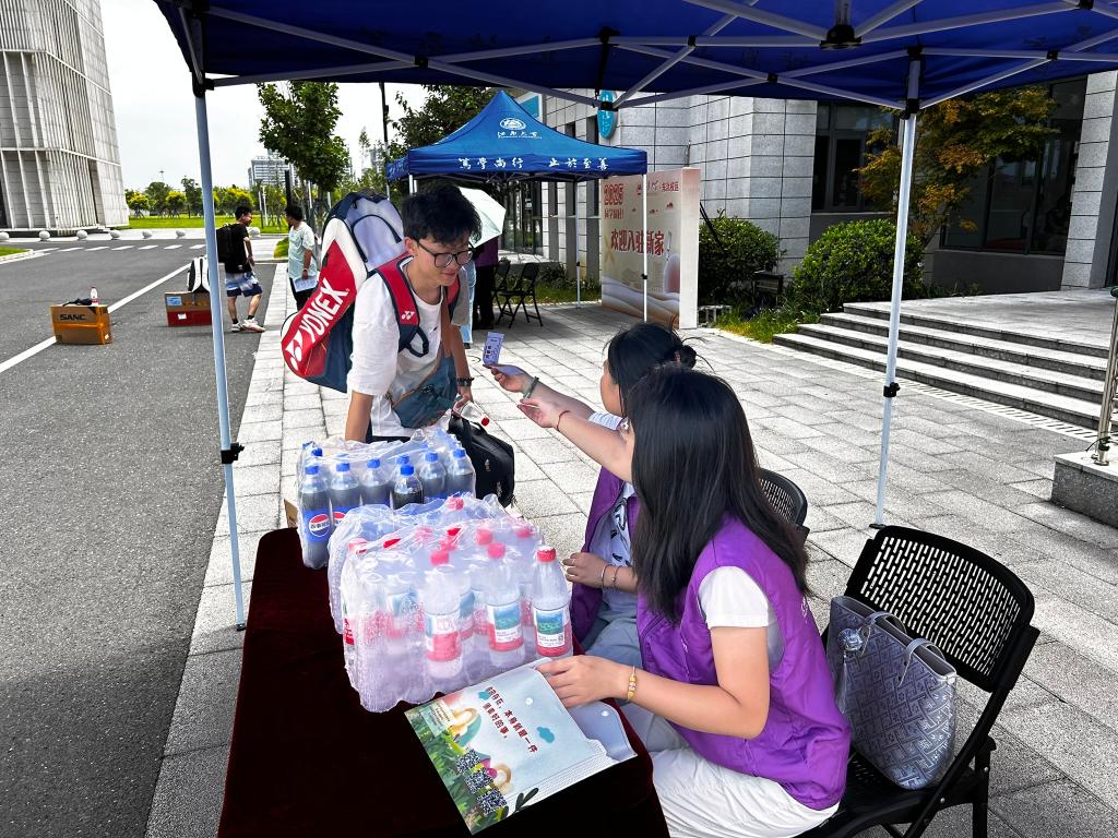 志愿者为入驻学生发放餐券、冷饮券