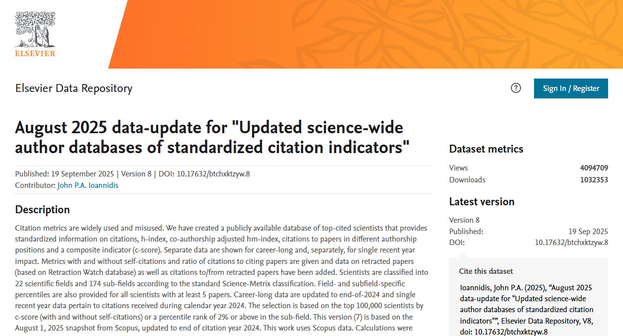 2025年9月,美国斯坦福大学联合爱思唯尔数据库(Elsevier Data Repository)发布了“全球前2%顶尖科学家榜单2025”(Stanford University Top2% Scientists List 2025)。av片