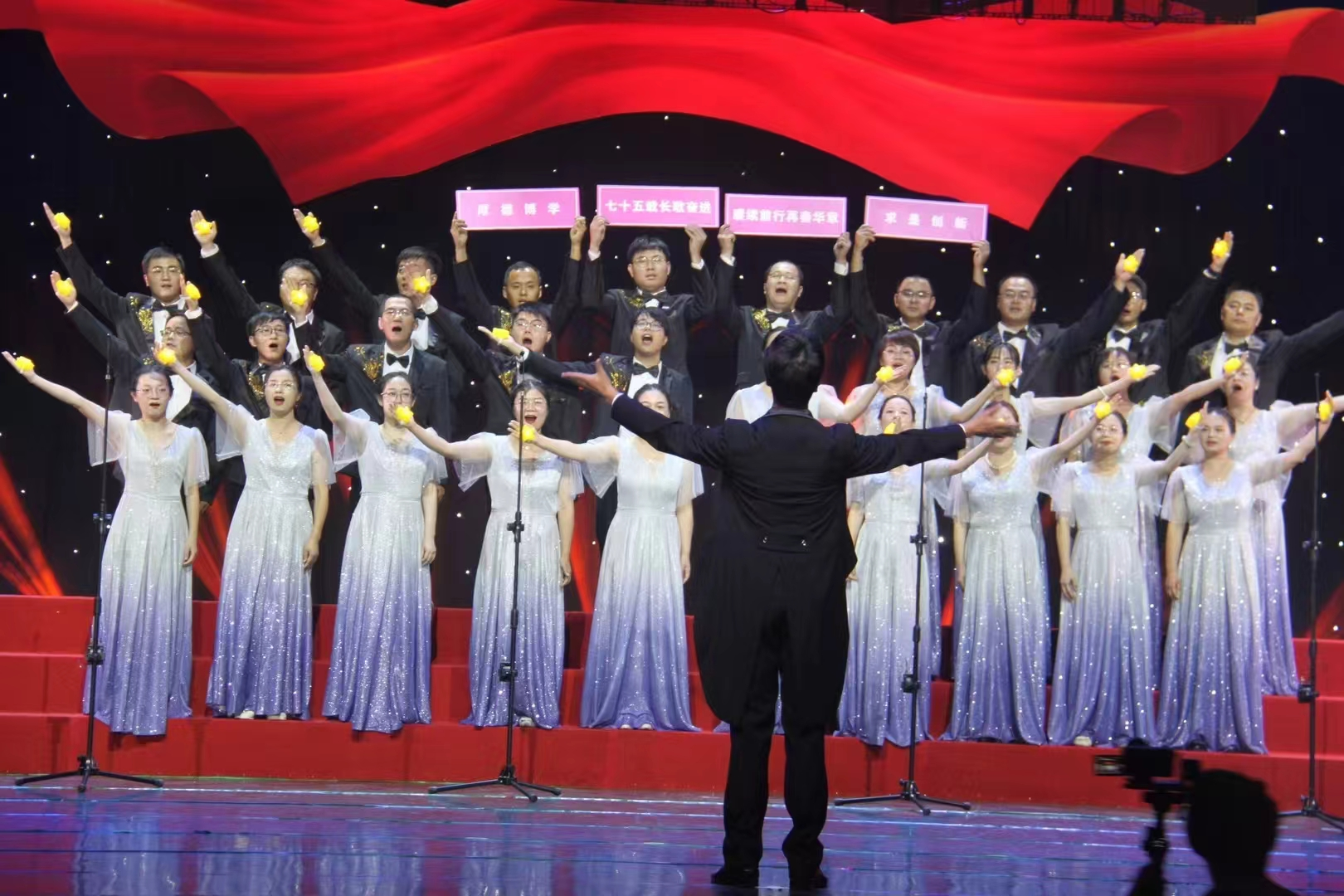 教职工统一着装,以饱满的热情和嘹亮的歌喉参加展演,用一首《向往》诉说着中华儿女对祖国的热爱、忠诚和感激。