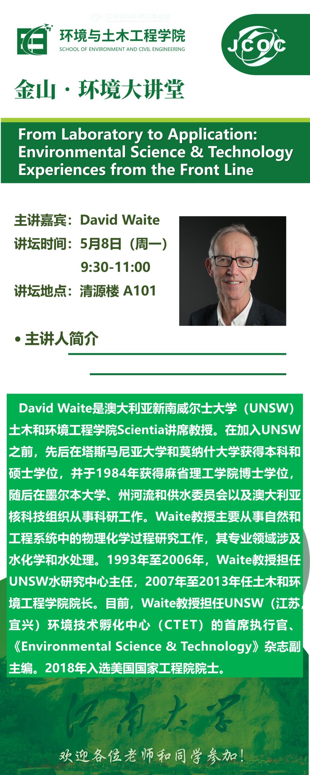 金山·环境大讲堂--David Waite:From Laboratory to Application: Environmental Science & Technology Experiences from the Front Line