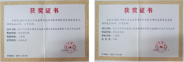 严群教授团队联合江苏中电创新环境科技有限公司、靖江华晟重金属防控有限公司共同申报的《电子行业重金属废水深度处理与资源化关键技术及产业化应用》获得2023年度江苏省高等学校科技进步奖二等奖。
